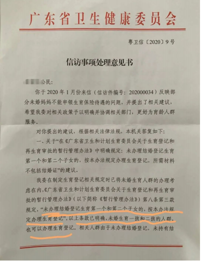 2020年3月,广东省卫生健康委员会在答复关于“部分未婚妈妈不能申领生育保险待遇的问题”时明确,“未婚生育一孩和二孩的人群,也可以办理生育登记。相关人群由于未办理结婚登记,未持有结婚证,在办理时可不提供结婚证。”