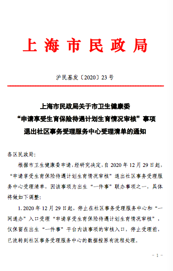 2020年12月25日,张萌在诉讼之外,等来了一个“好消息”。上海市民政局宣布:“申请享受生育保险待遇计划生育情况审核”退出社区事务受理服务中心受理清单。