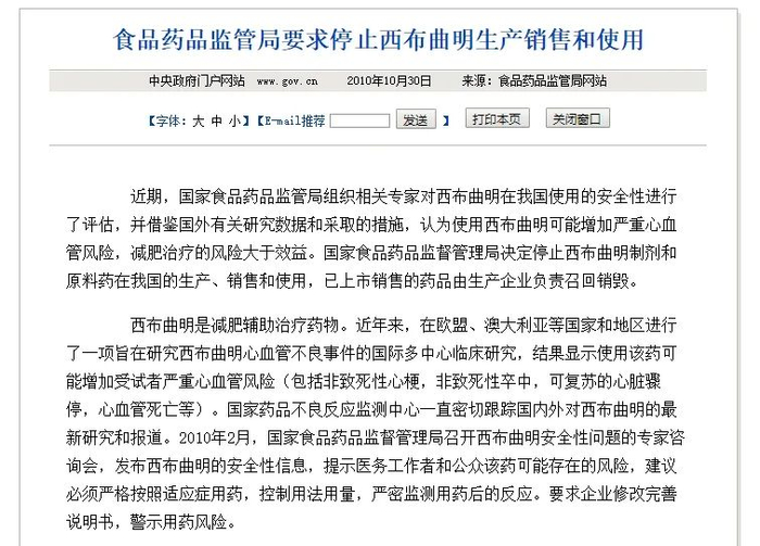早在2010年2月26日,原国家食药监局对于西布曲明进行安全信息及风险提示,2010年10月30日正式发布通知,要求停止生产销售西布曲明制剂及原料药。
