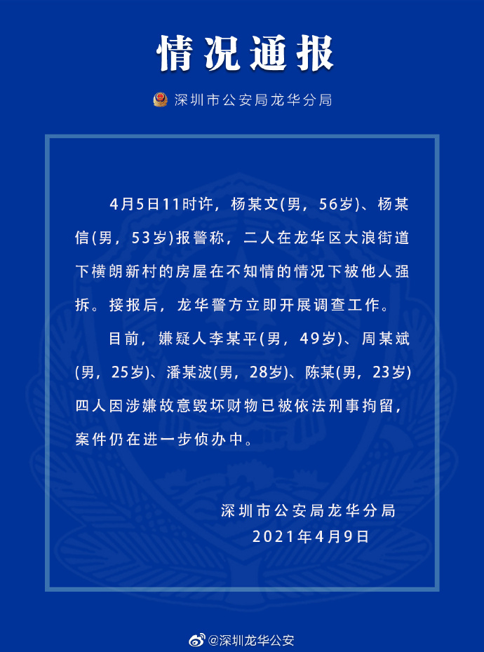 此前,深圳市公安局龙华分局9日晚发布“情况通报”。通报称,4月5日11时许,杨某文(男,56岁)、杨某信(男,53岁)报警称,二人在龙华区大浪街道下横朗新村的房屋在不知情的情况下被他人强拆。接报后,龙华警方立即开展调查工作。目前,嫌疑人李某平(男,49岁)、周某斌(男,25岁)、潘某波(男,28岁)、陈某(男,23岁)四人因涉嫌故意毁坏财物已被依法刑事拘留,案件仍在进一步侦办中。
