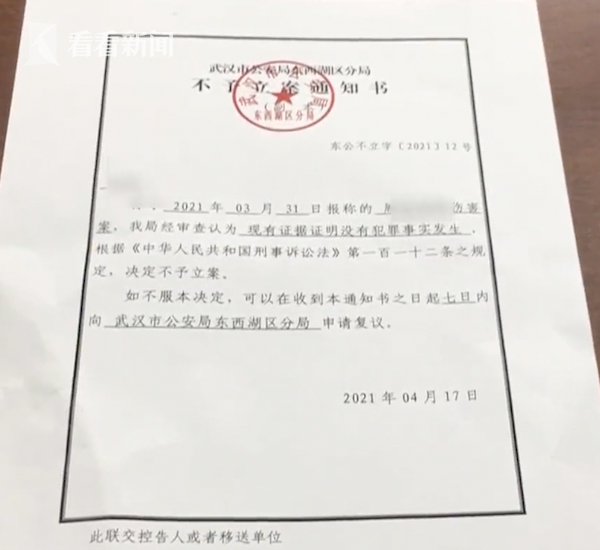 17日上午,在武汉市东西湖区金银湖街道办事处信访接待中心,警方孩子母亲刘女士递交了不予立案通知书。通知书上表示:经审查认为现有证据证明没有犯罪事实发生,根据《中华人民共和国刑事诉讼法》第一百一十二条规定,决定不予立案。