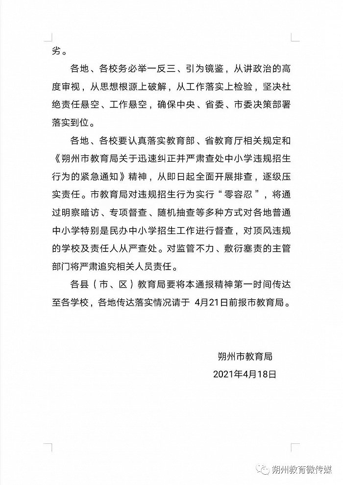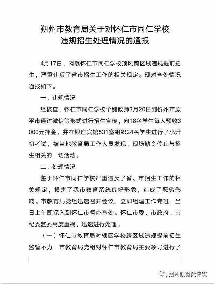 据“朔州教育微传媒”微信公众号消息,山西朔州市教育局发布关于对怀仁市同仁学校违规招生处理情况的通报。4月17日,网曝怀仁市同仁学校顶风跨区域违规提前招生,严重违反了省市招生工作的相关规定。经核查,怀仁市同仁学校个别教师3月20日到忻州市原平市通过微信等形式进行招生宣传,向18名学生每人预收3000元押金,并在银座宾馆531室组织24名学生进行了小升初考试,被当地教育局工作人员发现,现场勒令停止与招生相关的一切活动。