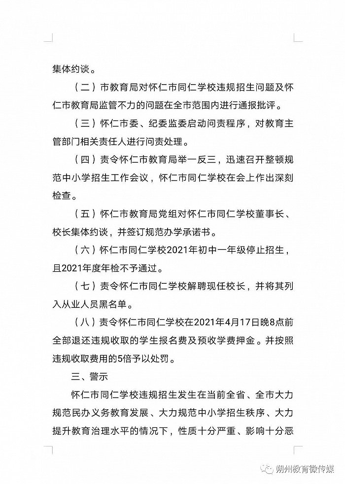 通报显示,怀仁市教育局对辖区学校跨区域违规提前招生监管不力,市教育局党组对怀仁市教育局主要领导进行了集体约谈。怀仁市委、纪委监委启动问责程序,对教育主管部门相关责任人进行问责处理。怀仁市同仁学校2021年初中一年级停止招生,且2021年度年检不予通过。责令怀仁市同仁学校解聘现任校长,并将其列入从业人员黑名单。责令怀仁市同仁学校在2021年4月17日晚8点前全部退还违规收取的学生报名费及预收学费押金。并按照违规收取费用的5倍予以处罚。