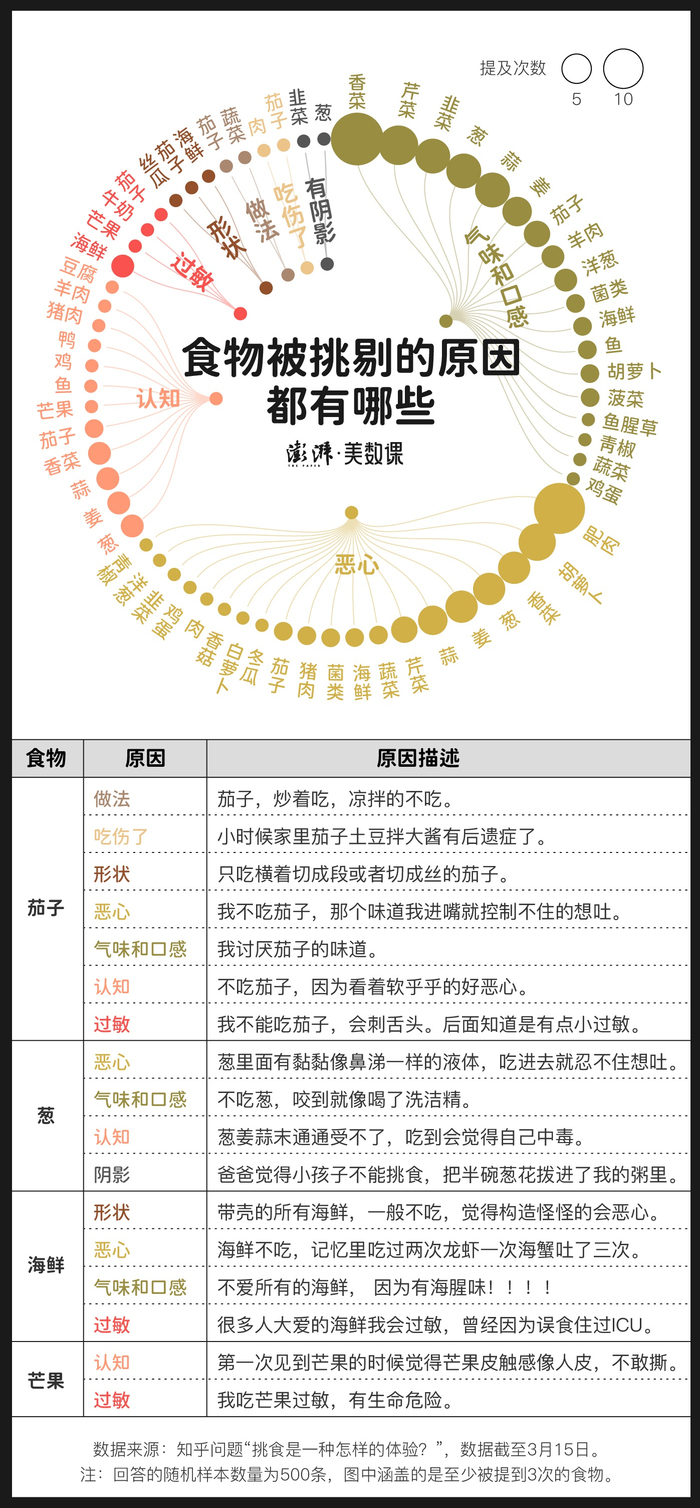 通过观察知乎上网友对于挑食经历的描述,我们找到了8种最常见的挑食原因,可以进一步归纳为:生理型、视觉型和观念型。其中,许多人将生理型挑食视为唯一可以接受的正当挑食理由。