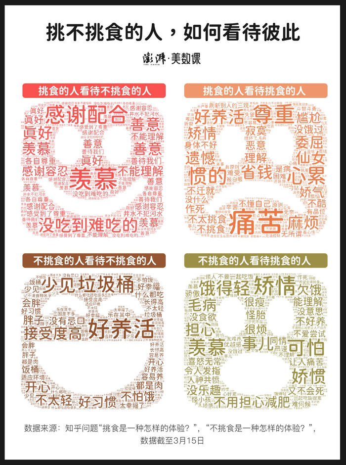 观察那些挑食的人写自己的经历,起初像在看一场“谁更挑剔”的比赛。但在那一串长长的食物名单背后,是许多挑食的人无力去改变的现实。与很多人认为的“没饿够”、“装”、“矫情”不同的是,许多挑食的人觉得挑食是一件痛苦而麻烦的事,希望能够得到更多人的尊重和理解。