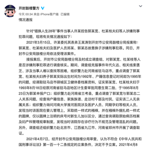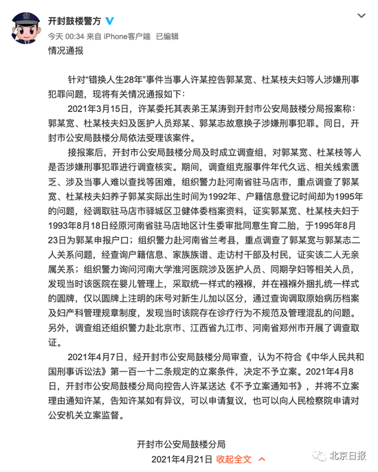 4月21日凌晨,开封市公安局鼓楼分局微博针对“错换人生28年”事件当事人许某控告郭某宽、杜某枝夫妇等人涉嫌刑事犯罪问题,发布情况通报。