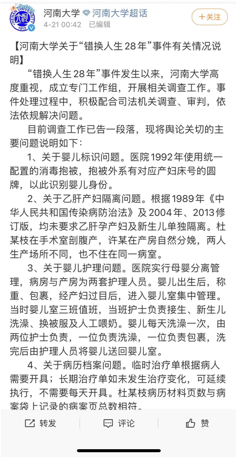 河南大学微博也在差不多时间发布情况说明,“错换人生28年”事件发生以来,河南大学高度重视,成立专门工作组,开展相关调查工作。事件处理过程中,积极配合司法机关调查、审判,依法依规解决问题。