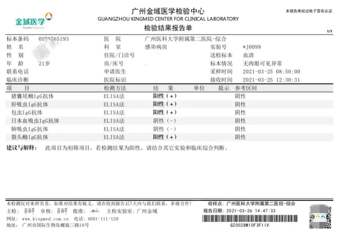 若结果是阴性,则可放心;万一是阳性,也无需忧心,通过住院驱虫治疗可治愈。