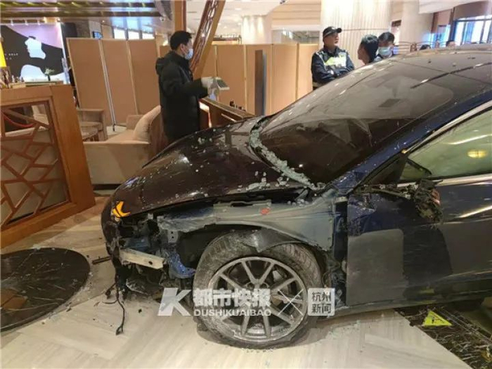 2020年12月30日,杭州一辆特斯拉冲进温德姆酒店大堂,司机说车子失控,只能撞向柱子减速。