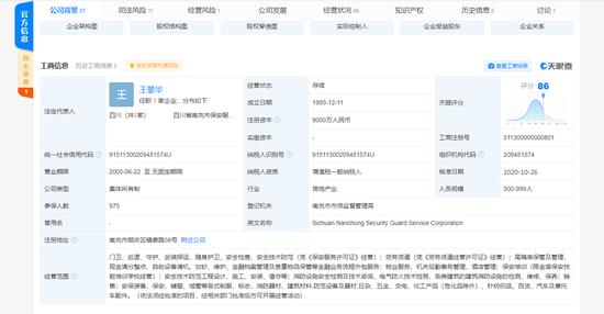 据悉,涉事守押公司为四川省南充市保安服务总公司。天眼查显示,该公司成立于1993年12月,注册资本9000万元,法定代表人王晏华,是一家从事保安服务的企业,经营范围包括门卫、巡逻、守护、武装押运、随身护卫、安全检查、安全技术防范;劳务派遣;尾箱库保管及管理,现金清分整点,自助设备清机、加钞、维护,金融档案管理及贵重物品保管等金融业务流程外包服务等。