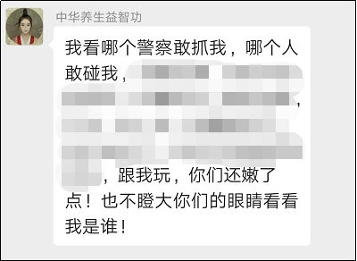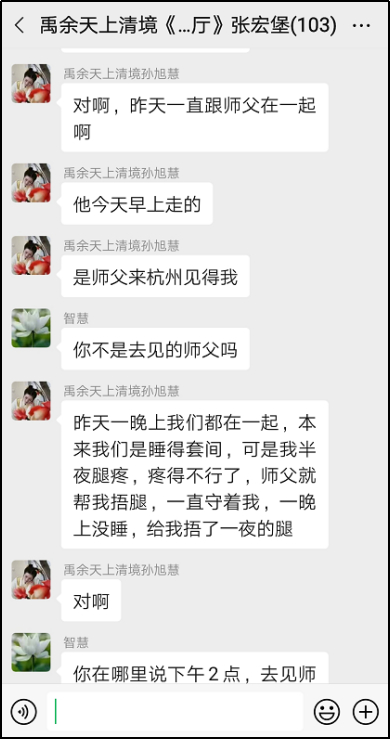 在微信群里,孙旭慧对群友们说,“我可是特医师祖张宏堡尊师培养出来的孩子”,并常常以张宏堡传人的名义传达各种所谓“师父的指令”。