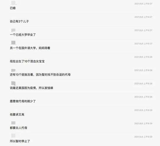 爆料人还透露,目前已出生了10个混血女宝宝,“老大快两岁了,老九和老十今年四月刚出生,已带回8个孩子回国。还有10个胚胎冻着,因为暂时找不到合适的代母”。