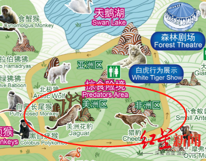 据杭州野生动物世界官网地图显示,园区在“掠食险境”主题园区内,设有美洲花豹和猎豹区。该主题园区的官方介绍为,“‘掠食险境’占地约40亩,汇聚了来自亚、美、非三大洲近30种猛兽,与世界的野生动物保护和管理理念相接轨,开创猛兽观赏新模式。”