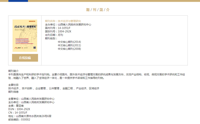 公开信息显示,《技术经济与管理研究》创刊于1980年,由山西省人民政府发展研究中心主办,为北大核心期刊。