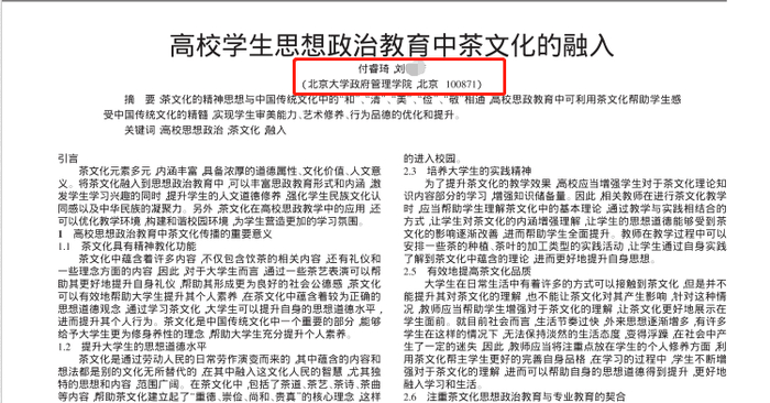 实际上2018年,知网上共收录了三篇付睿琦的论文。除上文所提论文外,还有《高校学生思想政治教育中茶文化的融入》《“低碳+”战略引领经济建设》,分别发表于2018年6月和2018年7月,作者单位均为“北京大学”或“北京大学政府管理学院”。