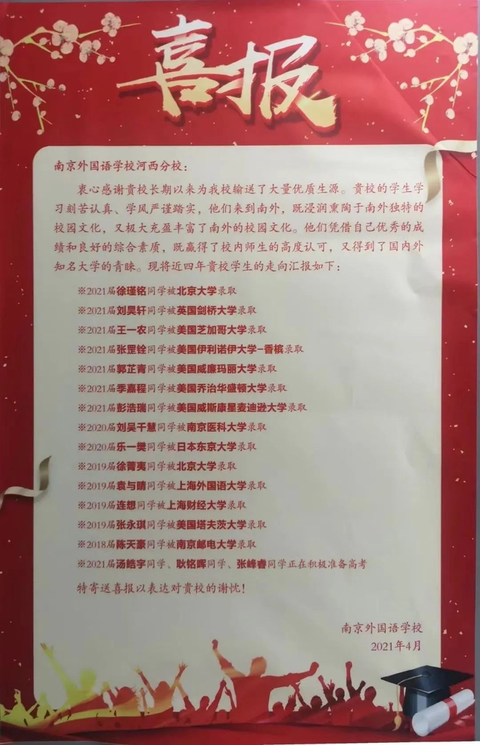 澎湃新闻记者注意到,引发外界关注的“喜报”,系南京外国语学校在今年4月发送给南京外国语河西分校(下简称南外河西分校)的。