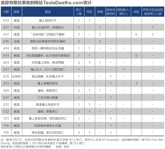 追踪特斯拉事故的网站TeslaDeaths.com统计,截至5月7日,全球涉及特斯拉车辆的车祸已导致181人死亡,其中6人涉及AP(Autopilot,自动辅助驾驶)或FSD(Full Self-Driving,完全自动驾驶)。2021年以来共发生17起事故,致23人死亡。(见下图表)