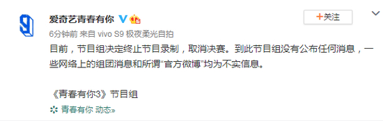 《青春有你3》节目组决定终止节目录制,取消决赛 新浪新闻 新浪新闻官方账号 05月09日14:58 关注 听新闻 来源:爱奇艺青春有你 目前,节目组决定终止节目录制,取消决赛。到此节目组没有公布任何消息,一些网络上的组团消息和所谓“官方微博”均为不实信息。 《青春有你3》节目组