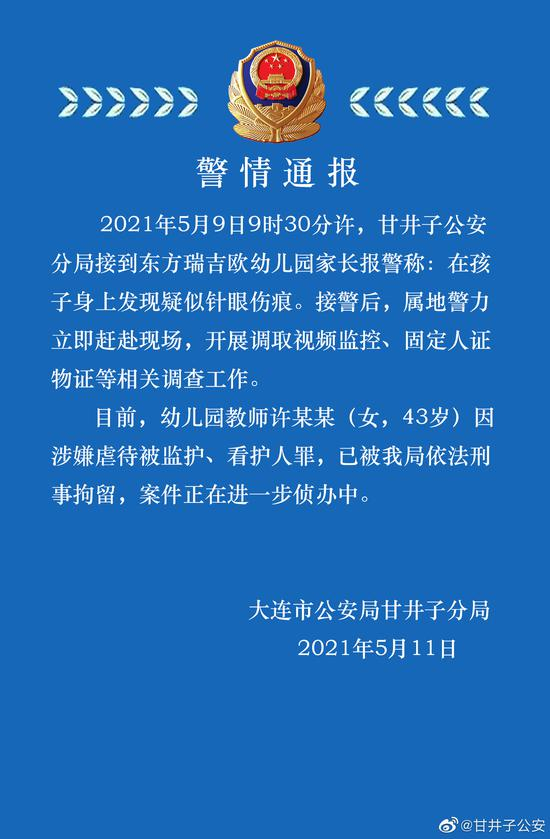 大连东方瑞吉欧幼儿园一教师因涉嫌虐待被刑事拘留 孩子身上发现疑似针眼