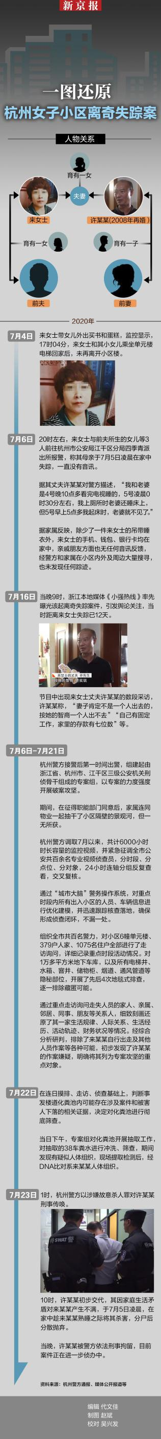 据新京报此前报道,7月25日上午,杭州市公安局召开“杭州女子失踪事件”新闻通气会。据犯罪嫌疑人许某某初步交代,其因家庭生活矛盾对其妻来某利产生不满,2020年7月5日凌晨,在家中趁来某利熟睡之际将其杀死,分尸后分散抛弃。目前,犯罪嫌疑人许某某已被依法采取刑事强制措施。