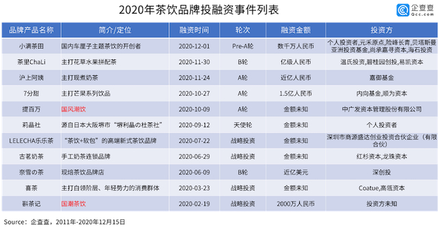 也许是“口味效应”使然,近两年茶饮行业的融资金额相比往年大幅攀升。企查查数据显示,2020年茶饮品牌共发生融资事件11起,与去年基本持平,不过披露金额达到10.4亿元,同比大涨378.6%。