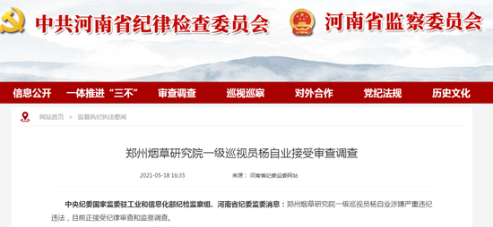 中央纪委国家监委驻工业和信息化部纪检监察组、河南省纪委监委消息:郑州烟草研究院一级巡视员杨自业涉嫌严重违纪违法,目前正接受纪律审查和监察调查。详情>>