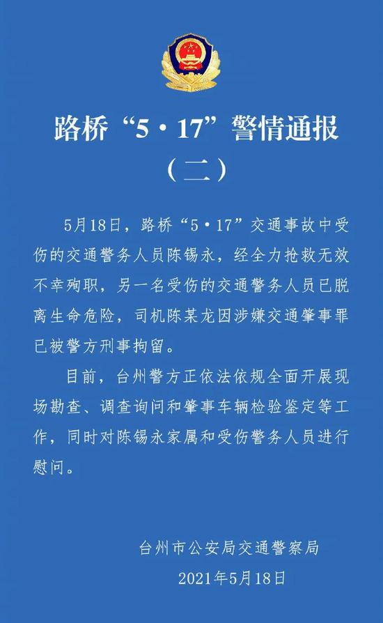 5月18日,路桥“5·17”交通事故中受伤的交通警务人员陈锡永,经全力抢救无效不幸殉职,另一名受伤的交通警务人员已脱离生命危险,司机陈某龙因涉嫌交通肇事罪已被警方刑事拘留。目前,台州警方正依法依规全面开展现场勘查、调查询问和肇事车辆检验鉴定等工作,同时对陈锡永家属和受伤警务人员进行慰问。