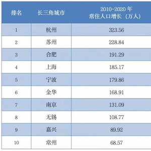 导读:2010-2020年,在长三角城市常住人口增长数量方面,杭州、苏州、合肥位列前三,上海居第四,南京第七。金华、嘉兴两座GDP为5000亿元上下的城市也挺进前十。