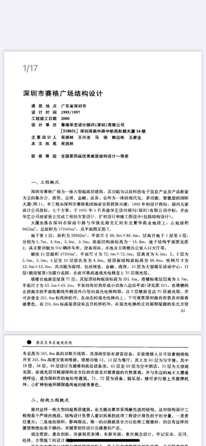 5月20日,赛格大厦此前的结构图也在网络上曝光,该结构图显示,赛格大厦的设计,是中国结构工程师第一次承担超高层钢混结构设计,而该设计还曾获得“全国第四届优秀建筑结构设计一等奖”。