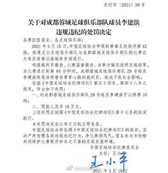 中国足协官方发布处罚公告,成都蓉城球员李建滨因辱骂裁判员停赛10场,罚款10万。(央视网体育)