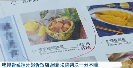 此前,江苏南京的吴女士在饭店吃排骨时磕掉一颗牙,吴女士认为是排骨的问题,与饭店一番理论后,饭店同意免单。之后吴女士又提出,饭店应承担自己的医药费,被拒后吴女士将饭店告上法庭,索赔医药费、误工费、交通费共计5000元。法院认为,商家提供的图片与食物一致,排骨中没有其他异物,已经尽到了自己的义务。最终,法院审理驳回了吴女士的诉求。(荔枝新闻)