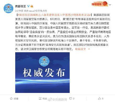 南部战区新闻发言人田军里空军大校表示,5月20日,美“威尔伯”号导弹驱逐舰未经中国政府批准,非法闯入中国西沙领海,中国人民解放军南部战区组织海空兵力跟踪监视并予以警告驱离。战区部队时刻保持高度戒备状态,坚决捍卫国家主权安全和南海地区和平稳定。(人民日报)