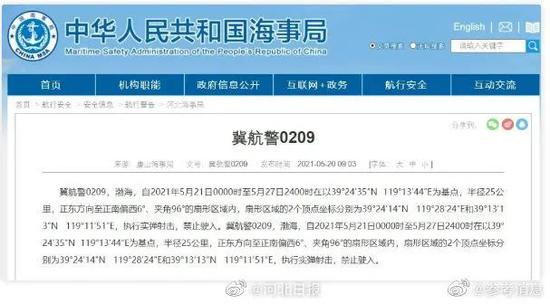 据中国海事局网站消息,唐山海事局发布航行警告,5月21日0时至5月27日24时,渤海部分海域执行实弹射击,禁止驶入。(@参考消息)