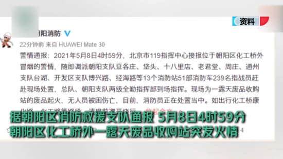 近日来,北京发生多起火灾事故,2021年5月8日早上5点,朝阳区十八里店乡西直河村一个再生资源回收站发生火灾,现场浓烟滚滚。消防部门共调动13个消防站、51部消防车、239名指战员赶赴现场处置,经过4个小时的紧张扑救,明火被彻底扑灭。消防员开始清理余火,下午1点57分所有救援力量撤离现场。起火的是废品,过火面积1450平方米,没有人员被困伤亡。