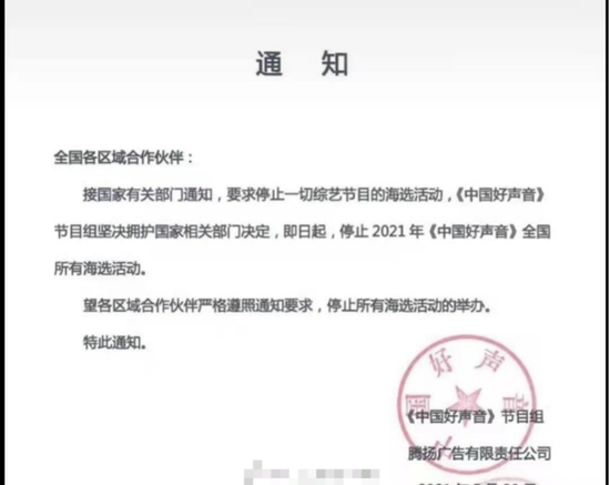 5月24日,一张《中国好声音》节目组的通知在网上流传开来,通知中明确写道:接国家有关部门通知,要求停止一切综艺节目的海选活动。该节目组表态坚决拥护国家相关部门决定,就此停止2021年在全国所有的海选活动。