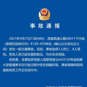 据@玉溪交警官方微博 消息,2021年5月27日13时48分,昆磨高速公路G8511下行线(昆明往版纳方向)K138+870米处(峨山立交至化念之间)发生一起交通事故。目前,事故造成1人死亡,8人受伤。受伤人员已送往医院救治,均无生命危险。