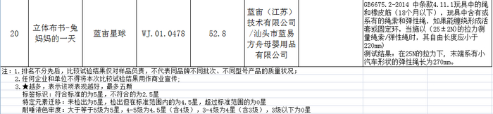 除了散落的小零件,当布书中含有绳索或弹性绳时,如果能缠绕成活套或固定环套,对婴幼儿也会存在勒伤的危险。所幸的是,在本次比较试验中,19件样品的绳索和弹性绳测试结果均符合标准要求,仅1件样品——蓝宙星球的立体布书(兔妈妈的一天)在25牛顿的拉力下, 末端系有小汽车形状的弹性绳长为270mm,大于国家标准要求的220mm。