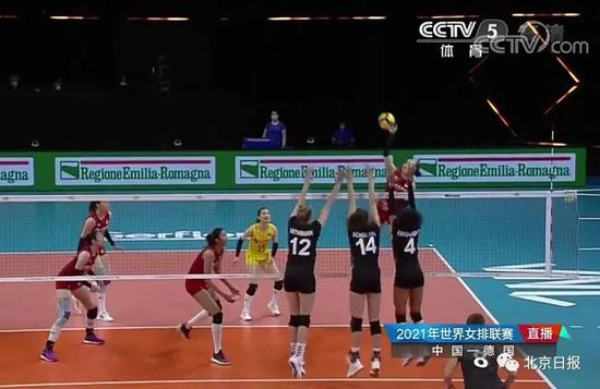拿下一局后,中国女排信心大增,终于在拦网上打出了身高优势,多次拦住德国女排的进攻。25比21,中国女排将局分追至2平。