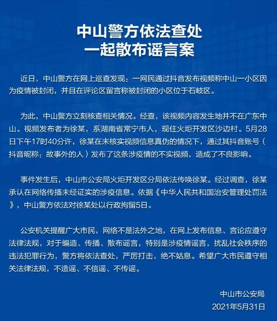 据中山市公安局官方微信通报,中山警方依法查处一起散布谣言案: