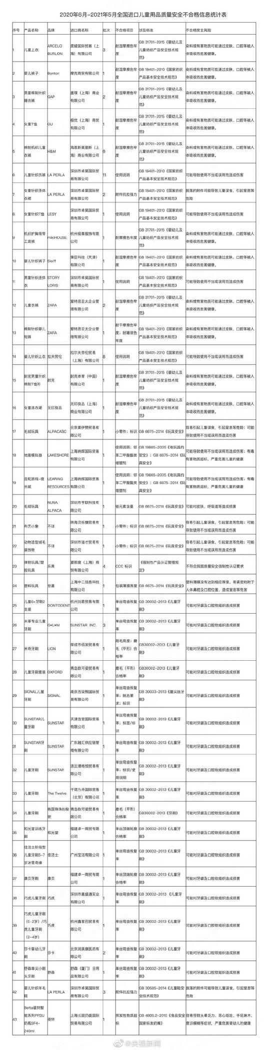 在“六一”国际儿童节到来之际,海关总署对2020年6月-2021年5月期间查发的部分进口儿童用品质量安全不合格情况进行通报(见附表),涉及儿童服装、儿童玩具、儿童牙刷、童鞋及奶嘴奶瓶等5类81批次进口儿童用品。