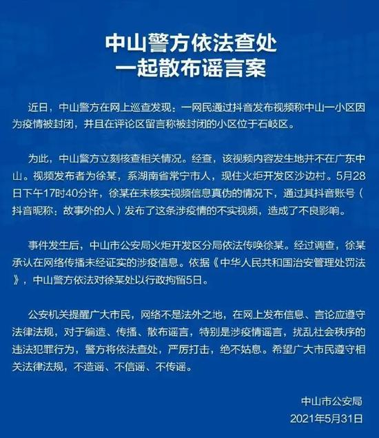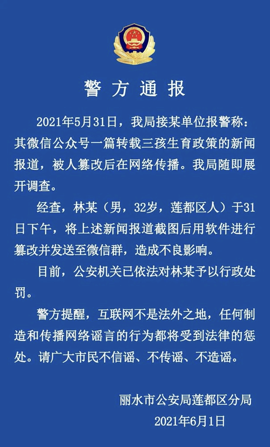 6月1日,浙江丽水公安局通报“男子篡改传播三孩政策新闻”一事,称已依法对林某予以行政处罚。