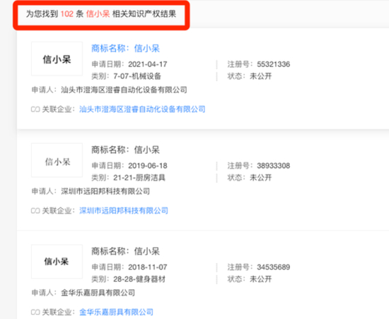 同时,笔者从天眼查看到,“信小呆”商标被多家公司抢注,找到了102个相关结果。