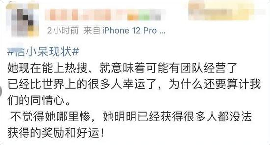 而微博百万粉丝大V霜叶质疑这次卖惨很像是为了新一轮的营销做准备的预热。笔者也发现信小呆的言论“所以我现在是当网红呢还是上个班呢”,也看起来像是呼应热搜配合营销。在更多网友看来,无论出于自愿还是依靠资本和热度的推动,流量当道之下,信小呆已然摆脱不了被裹挟的“工具人”身份。