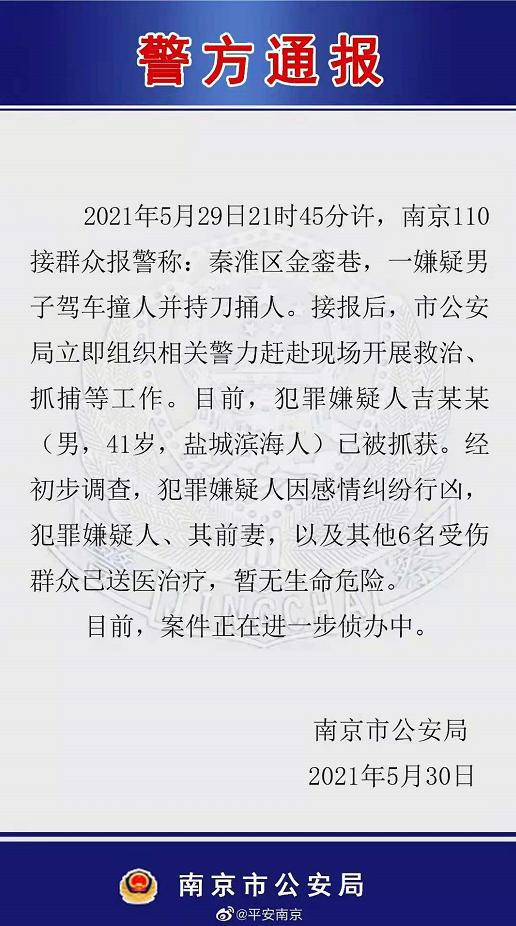 5月30日,南京警方就29日晚发生的伤人案件详细通报,当晚,犯罪嫌疑人吉某某与前妻张某因感情纠纷等矛盾,驾驶轿车撞倒前妻、其朋友及路人,随后下车持刀捅伤前妻朋友,并再次上车数次碾压前妻后开车逃窜,市民“南京胖哥”邱某某前来阻止,吉某某下车持刀将邱某某捅伤。