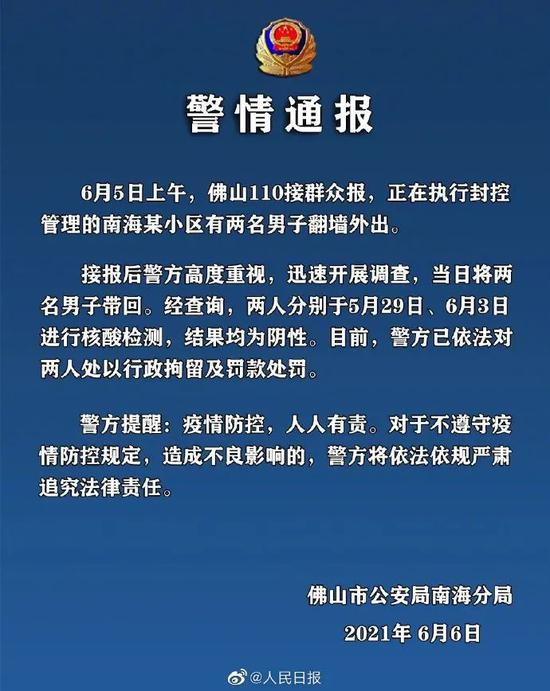 据南海公安6日通报,5日上午,广东佛山110接群众报,正在执行封控管理的南海某小区有两名男子翻墙外出。警方当日将两名男子带回。经查询,两人分别于5月29日、6月3日进行核酸检测,结果均为阴性。警方已依法对两人处以行政拘留及罚款处罚。