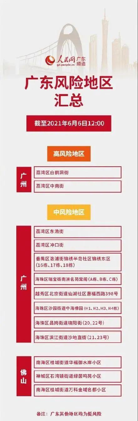 6月6日,广州市新冠肺炎防控指挥办医疗防治组发布通告,自6月6日起,越秀区北京街道仙湖社区惠福西路398号由低风险地区调整为中风险地区;海珠区沙园街道中海橡园(H1、H2、H3、H4栋)、昌岗街道晓阳街(20、22号)以及滨江街道沙地直街(21、23号)由低风险地区调整为中风险地区。其他地区风险等级不变。截至目前,广东省有高风险地区两个,中风险地区11个。
