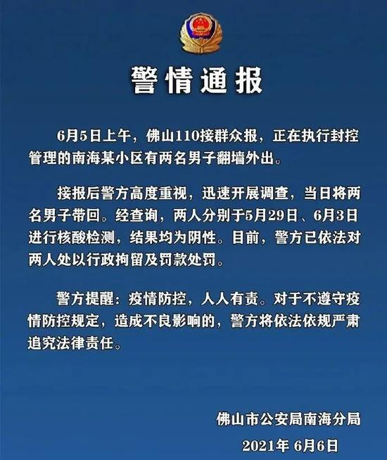 据南海公安,6月5日上午,广东佛山110接群众报,正在执行封控管理的南海某小区有两名男子翻墙外出。警方当日将两名男子带回。经查询,两人分别于5月29日、6月3日进行核酸检测,结果均为阴性。警方已依法对两人处以行政拘留及罚款处罚。