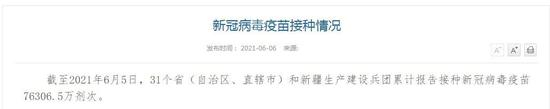 据国家卫健委通报,截至2021年6月5日,31个省(自治区、直辖市)和新疆生产建设兵团累计报告接种新冠病毒疫苗76306.5万剂次。
