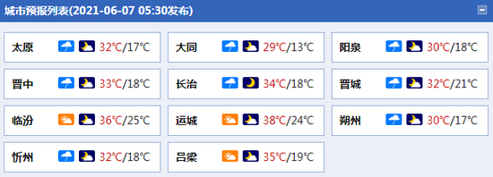 今天夜间到明天白天:全省多云间阴天,大部分地区有阵雨或雷阵雨;临汾、运城等地的部分县市有35℃、局部37℃以上的高温天气。最低气温:北部及中南部山区10~17℃,中南部其余地区17~23℃;最高气温:北部及中部山区26~32℃,中部其余地区及南部32~37℃。