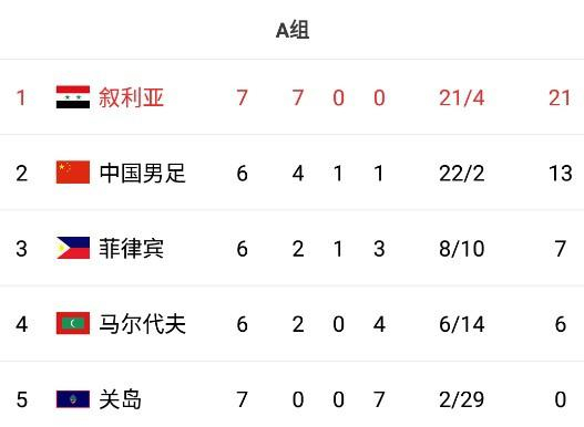 世预赛A组目前排名,叙利亚提前1轮获小组第一,中国男足2-0击败菲律宾后,基本锁定第二。